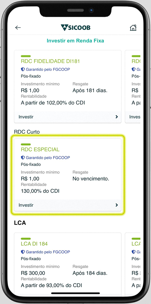 Ainda no App Sicoob, acesse → Menu → Investimentos → Renda Fixa → RDC Especial 130, digite o valor e invista com segurança e rentabilidade!